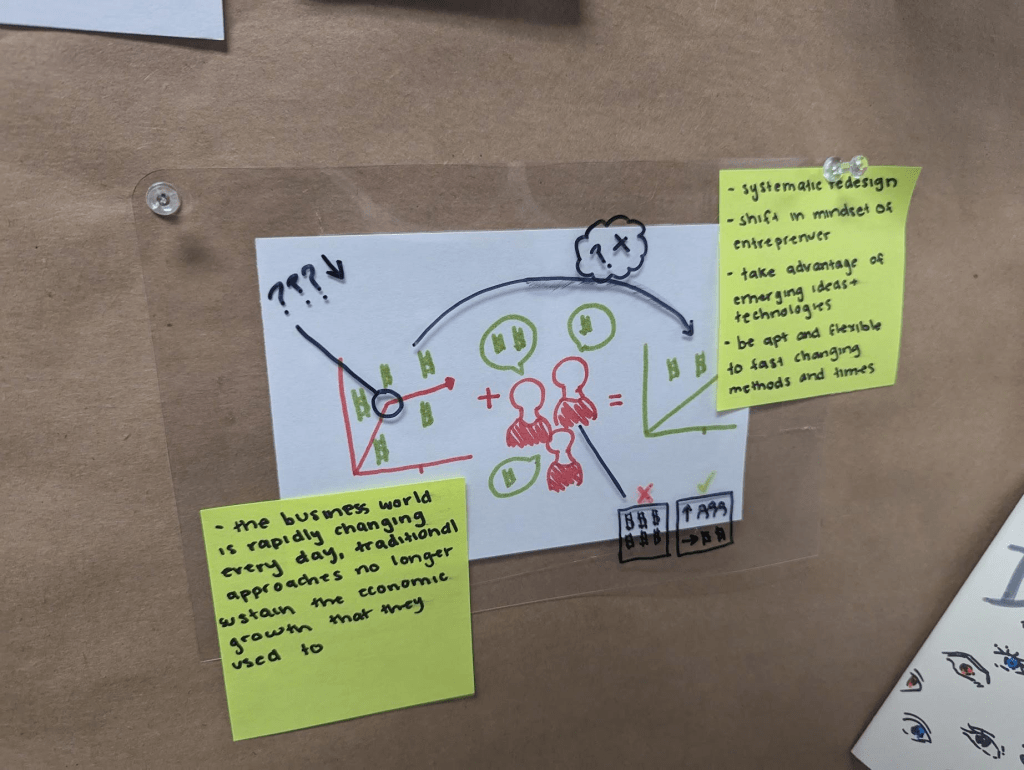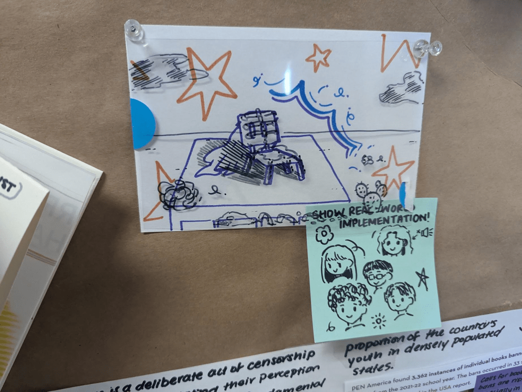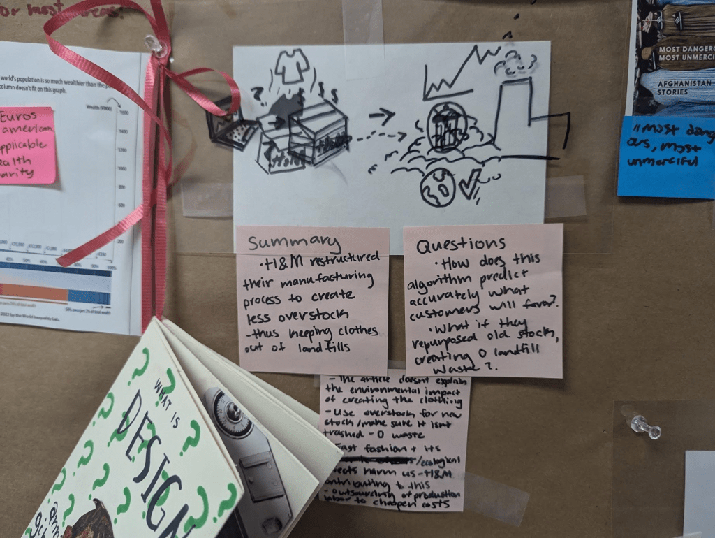 Materials included note cards, sticky notes, transparent films, and color markers (red and black). Design students read and annotated one of the case studies that aligned with their design research interests. Then, students summarized their understandings of the case studies visually, questioned the missing areas, and speculating the alternatives. By actively engaging with the design already in practice, students unlimited their understanding of design beyond industrial efficiency and professionalism through visual design.
