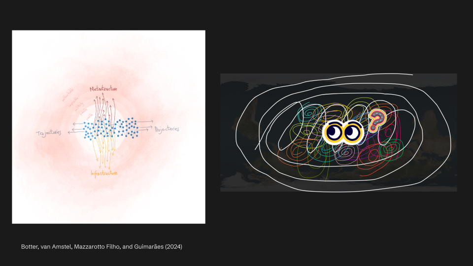 We use metaphors extensively—through physical metaphors like Lego serious play, as well as through deck cards and toolkits—to position ourselves as complex beings within complex systems. Through these metaphors, we are not only redesigning but also reproducing them. This involves receiving cultures as they are, with their associated stereotypes, while simultaneously reproducing cultures in ways that reflect our individual and collective perspectives. Yet, these reproductions can sometimes perpetuate stereotypes, which necessitates ongoing reflection and careful annotation over time.