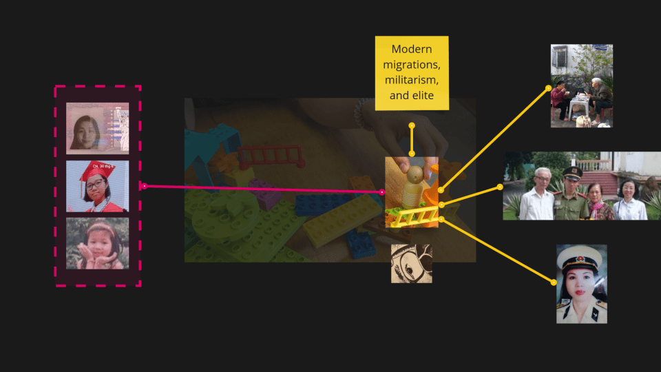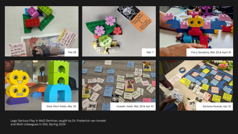 Beyond the classroom, I engage with physical metaphors like Legos and serious play in advising meetings, reflecting on my journey as an immigrant. What is that woodened doll in the chaos of systems crafted by Legos? It represents me at different stages of my life—from Vietnam to the United States, from being a citizen to becoming an immigrant. It is also a metaphor for my ancestors, grandparents, and family members, some of whom were involved in police departments and education. They embodied the institutional power of the Vietnamese government, which I perceived as a rigid structure at the time, though I did not have the language for it back then. When I came to the United States, it felt like a relief. I could explore art and design in ways that may not have been the norm in Vietnam or in my family.