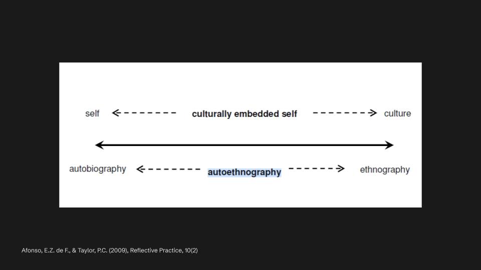 I engage with metaphors a lot in this critical process of reflecting and positioning my culturally embedded self. This involves constant dialogues with all of you, as well as with Fred and other professors. What is a culturally embedded self? It is the intersection between self and culture, a place where we reflect on ourselves as bodies that embody intertwining cultural complexities. I see the culturally embedded self not as an individualist perspective, but as one that projects the complexities of the cultures that the self has experienced. The culturally embedded self is unique, but it also acknowledges the collectives it has been part of.