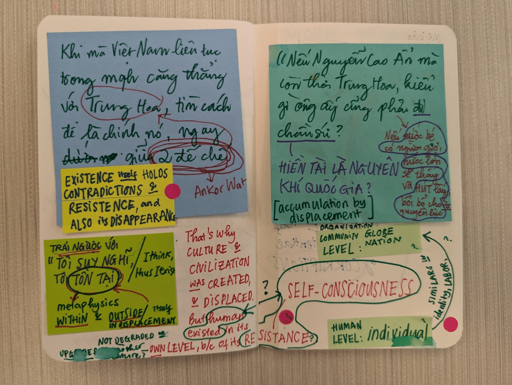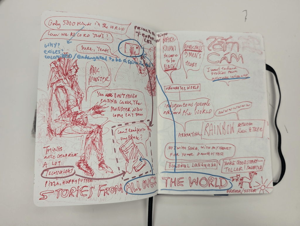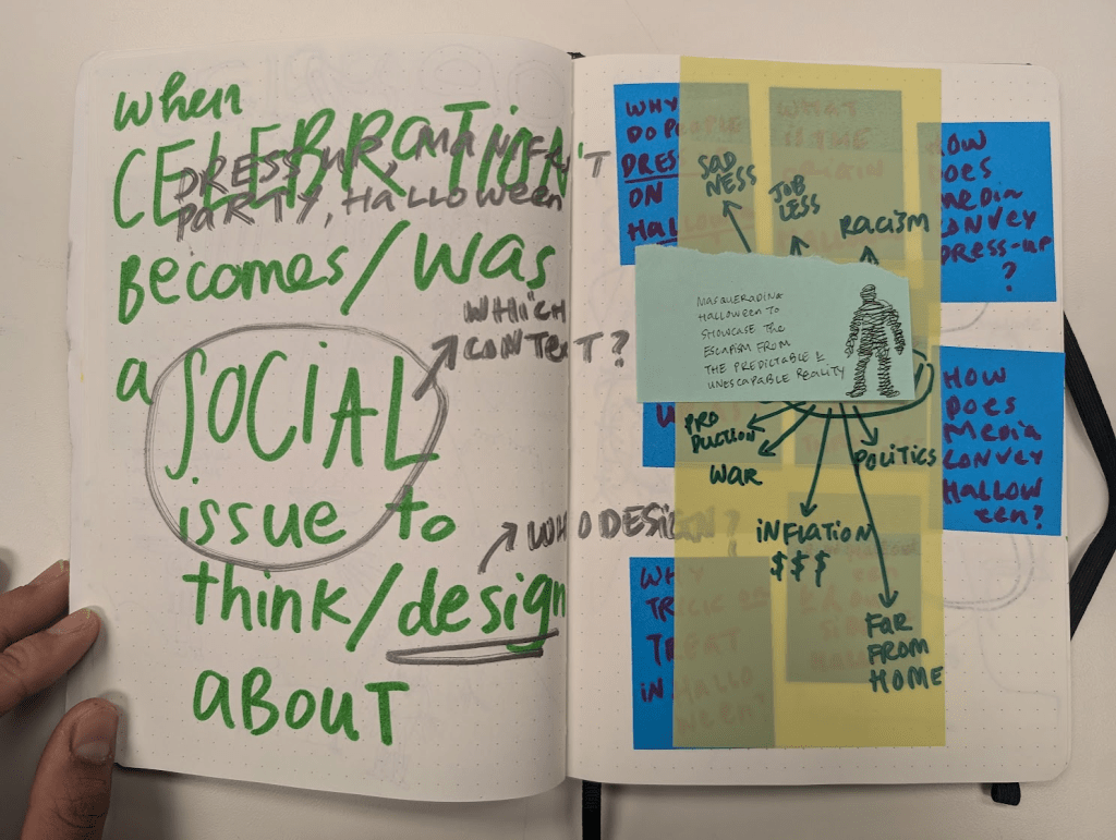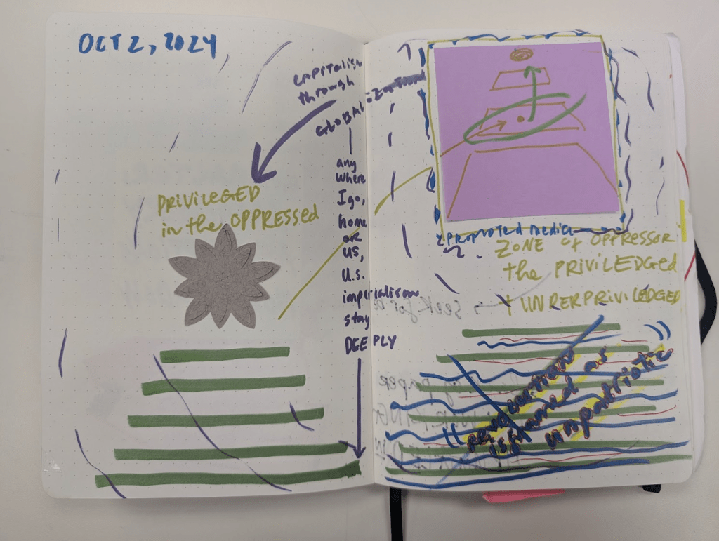 Per Paulo Freire, reading and rereading the world through our words allows us to see ourselves in a constantly changing world. Reading the world through others’ perspectives is a common practice, facilitated by books, newspapers, media, and social media. This habit often prevents us from actively crafting and reflecting on our own interpretations of the world. As I research and practice the autoethnographic design method, I have been engaging with visual diaries/journals to capture my world and the world of others. Over the past six months, I have used notebooks, notecards, sticky notes, and other paper forms to document my world visually. This process usually includes two steps: (1) documenting what I have observed/listened to, and (2) annotating these documentations immediately or some time after revisiting the notebooks. Initially, my journal pages were mainly filled with descriptions of what I saw and heard—a mix of text and images. Gradually, as my skills in fast handwriting and critical, illustrative annotation advanced, the live descriptions were enriched with timely questions and insights. I was able to link live events with systemic issues that we often do not discuss outside socio-political news media and academic research. The visual diary is an ethnographic observation method that allows for creativity and flexibility in the observer’s critical thinking and reflections.