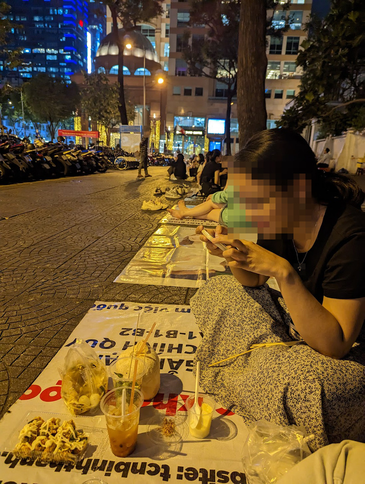 The street food carts were attempted to be removed from the pedestrian sidewalks for the idea of beautiful, clean, and green streets, but failed. More buildings and subways are built across the river in Hồ Chí Minh city, but the modern regulations could not bind our culture, society, and politics. When we bought food from the street, we bore the risk of not seeing the food cart one day because the sellers moved elsewhere to avoid being caught. The food cart was technically a DIY food organizer to be attached to a scooter or any wheelers. The street food sellers reused whatever materials that they have to hold food and reserve space for “dining”. We often had bánh mì and xôi wrapped in newspapers, chewing food that might have been printed with the morning news. Street food culture created a casual service style, allowing imperfections from service designers and users/consumers. Our food and drink is contaminated by transportation dust, street lights, bugs, noise of sale promos and bargains,… immersed in the busy city life. Anyone can buy and eat the street food, but not everyone would enjoy them. Although street food attracted tourists, they might be scared of the contaminations, as their foreign stomachs could not bare to local ingredients and mixes. Their minds are probably framed with the concept of Viet Nam through the branded, industrial food such as Phở which are often served in restaurants. The locals like the service could be of many things: the location, the food, the friends we eat with, the gossip we share, our conversations with the seller, and the seller themselves. Sometimes, children helped their parents with selling the products, the old people sell random things on the pedestrian sidewalk – although passengers might not be hungry or in need of them, some would buy these anyway.