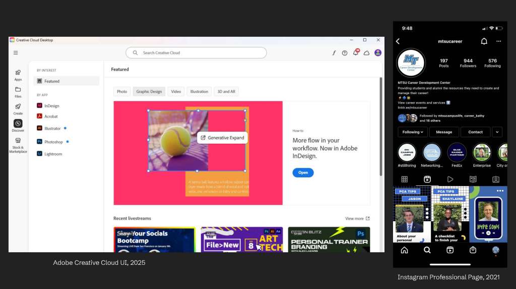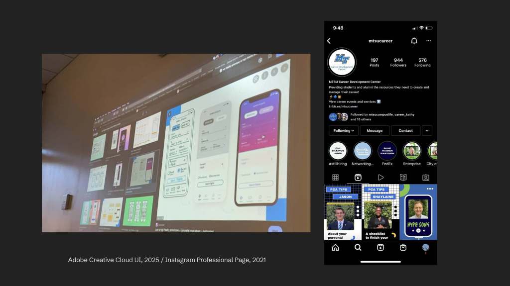 When we talked about the software, Adobe is so advanced because it provides compacted design space. But it also provides guidelines towards that space. It is within the space (software) such as tours in Adobe Illustrator but it also has the general dashboard such as Adobe Creative Cloud, (where you can download many Adobe software with certain fee of subscriptions). It now even produces Adobe Express, which is similar to Canva, right? It’s very compacted that now, business services are available and can be searched online, such as one of the student service office that I worked with in the past. The office also wants to increase the interactions online. So, almost every space has an Instagram account or a Twitter account to attract digital users/customers. You don’t have to go to career center to know that it’s physically there. It is there because it has many channels to promote it digitally, right? So that is a very good way… let’s say high-tech is a very great in promoting digital awareness, not consciousness, of the design space, service, and products – what is available out there.