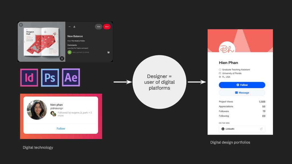 This is how I understand digital design technology (high-tech) in relation to designer. Designers use digital design technology, increasing the accessibility to show their works to other. Potential design collaborators who might hire you in the future or who might work with you in the future or potential users. If you happen to create your own agency in the future, right?