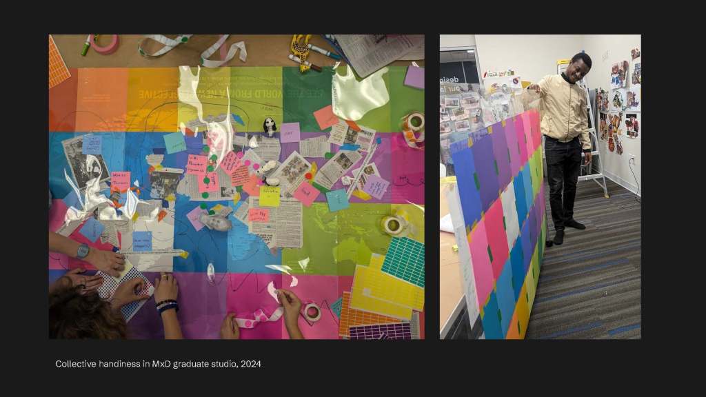 This is in our graduate studio, the MxD, and this is Sharif – another graduate teaching assistant. Through our graduate studio, we researched the possibilities of design. That’s why we use many, many low-tech, materials include tapes, papers, color labels, newspapers, and whatever recyclable materials. So any materials that are in its lifetime, then we use them for us to disclose our understanding of selves and what’s around us. Here, handiness is vividly observed as a result of something to be displayed on the table. Because of that, as I said, designers brought in the design projects with their positionality – worldviews, through the (low) design technology that they interact with during this project/process. You can to this understanding through, I bet that you already take, the design and identities course or the Design Studies course.