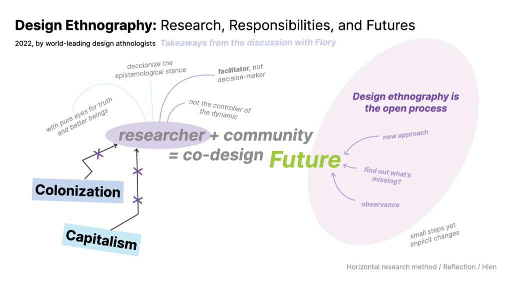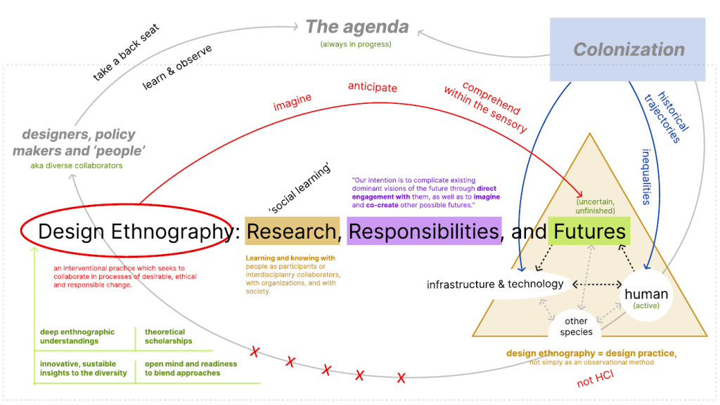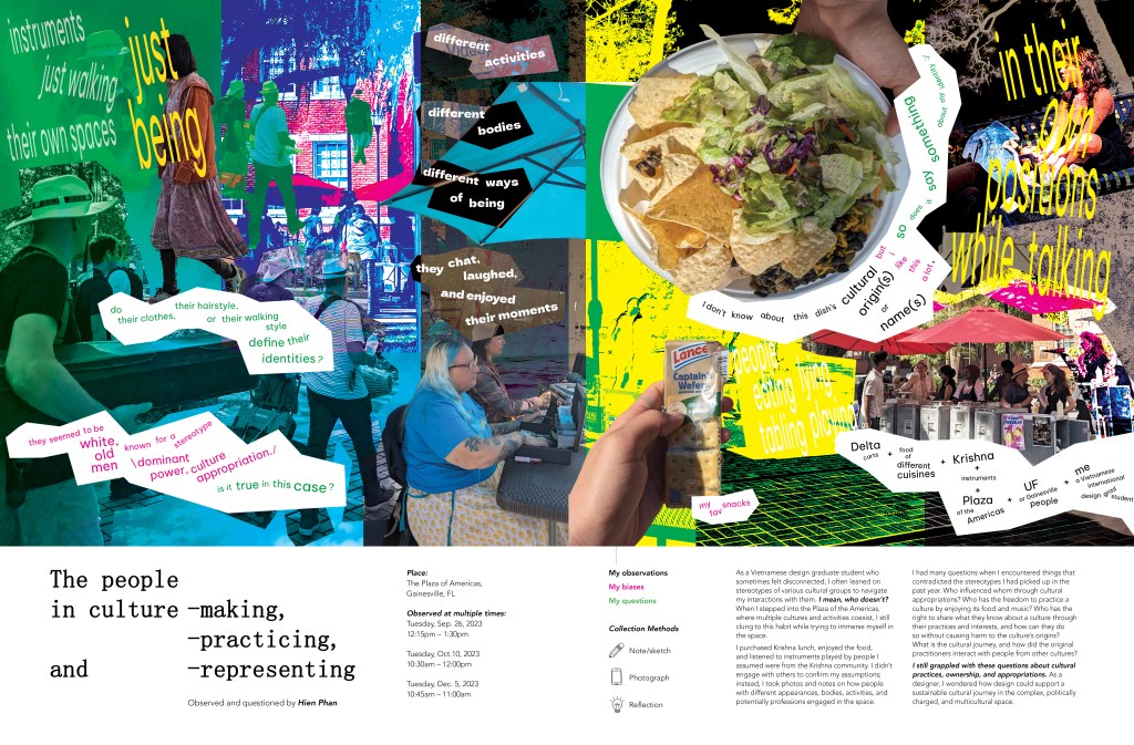 As much as I appreciated the ethnography practices, I learned to be critical of biases in ethnography that has been lured away by visual design, as well as the manifestation of critical theories in design practices that risked disrupting the genuine, authentic interactions. This made me move away from imposing theories to observations, as well as finessing aesthetics in ethnography observation for an accessible, universal, and inclusive piece of reading. Rather, I sought to engage critical questions through observations, being upfront of my worldview as a foreigner. This encouraged me not only to engage in ethnography observation but also autoethnography observation, where my worldview could be understood as an insider or a spy that tries to internalize and examine the surrounding cultures from the inside.