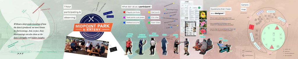After our grad cohort came back from the ethnographic observations, we typed up our observations in the past 1.5 hours. While my colleagues commented several issues such as privatized park, inaccessible restroom, expensive food, and fake aesthetics, I was surprised at their comments, which were absent or not that troublesome to my perspectives. I mostly documented the beautiful flowers, the fun engagement across the cohort, which was the first time I hung out with, and the ‘local food’ that I also tasted for the first time. In a way, the problems in the park were naturalized in my perspectives.